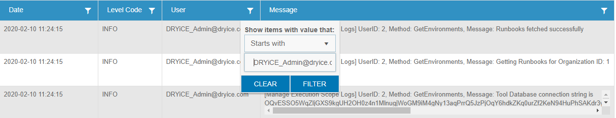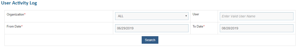 - Click Search to refine the User Activity Logs results. Depending on the application used to access the User Activity Logs, the Organization, User, or Date filter options will be available.