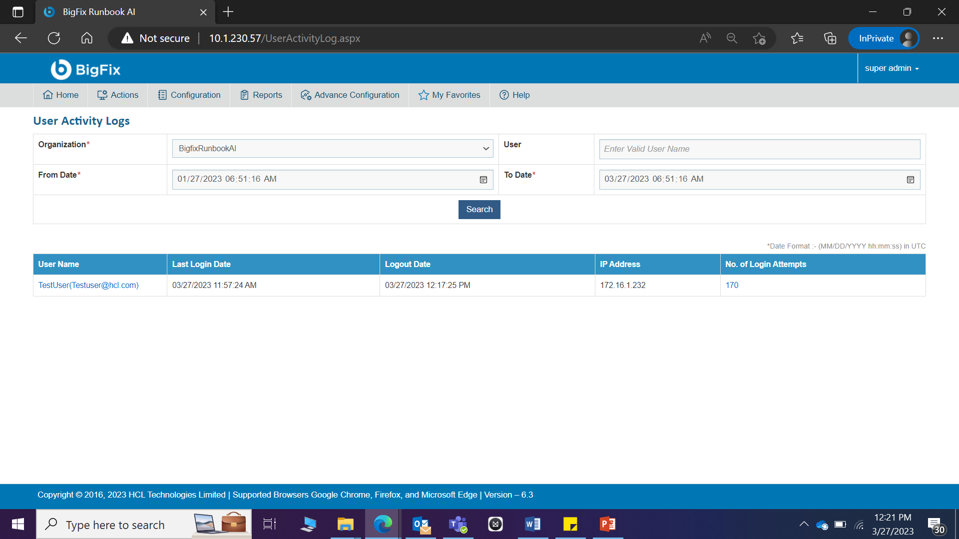 - To view the user activity history in BigFix Runbook AI, click Reports and then click User Activity Logs to access the User Activity Logs page.