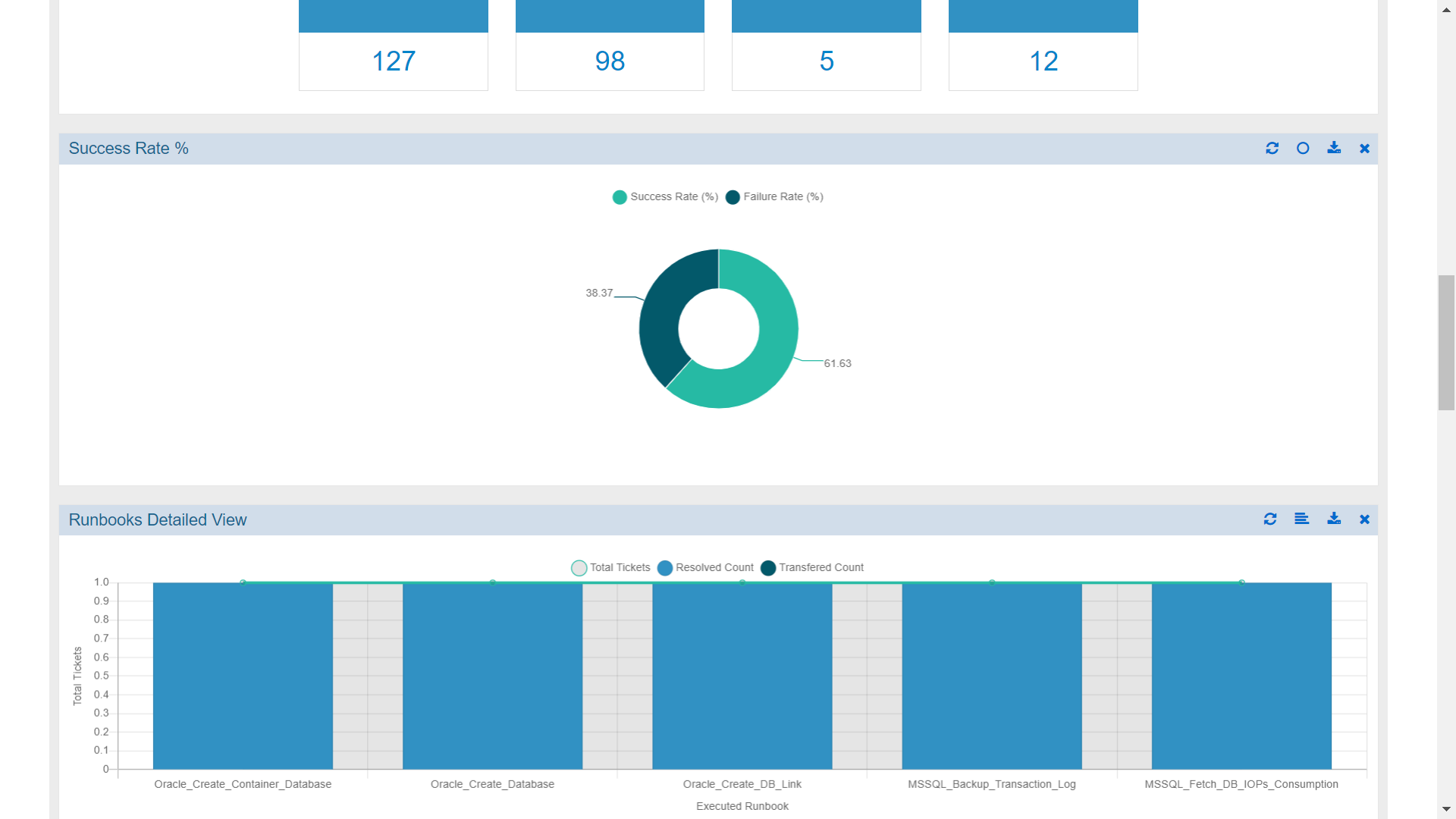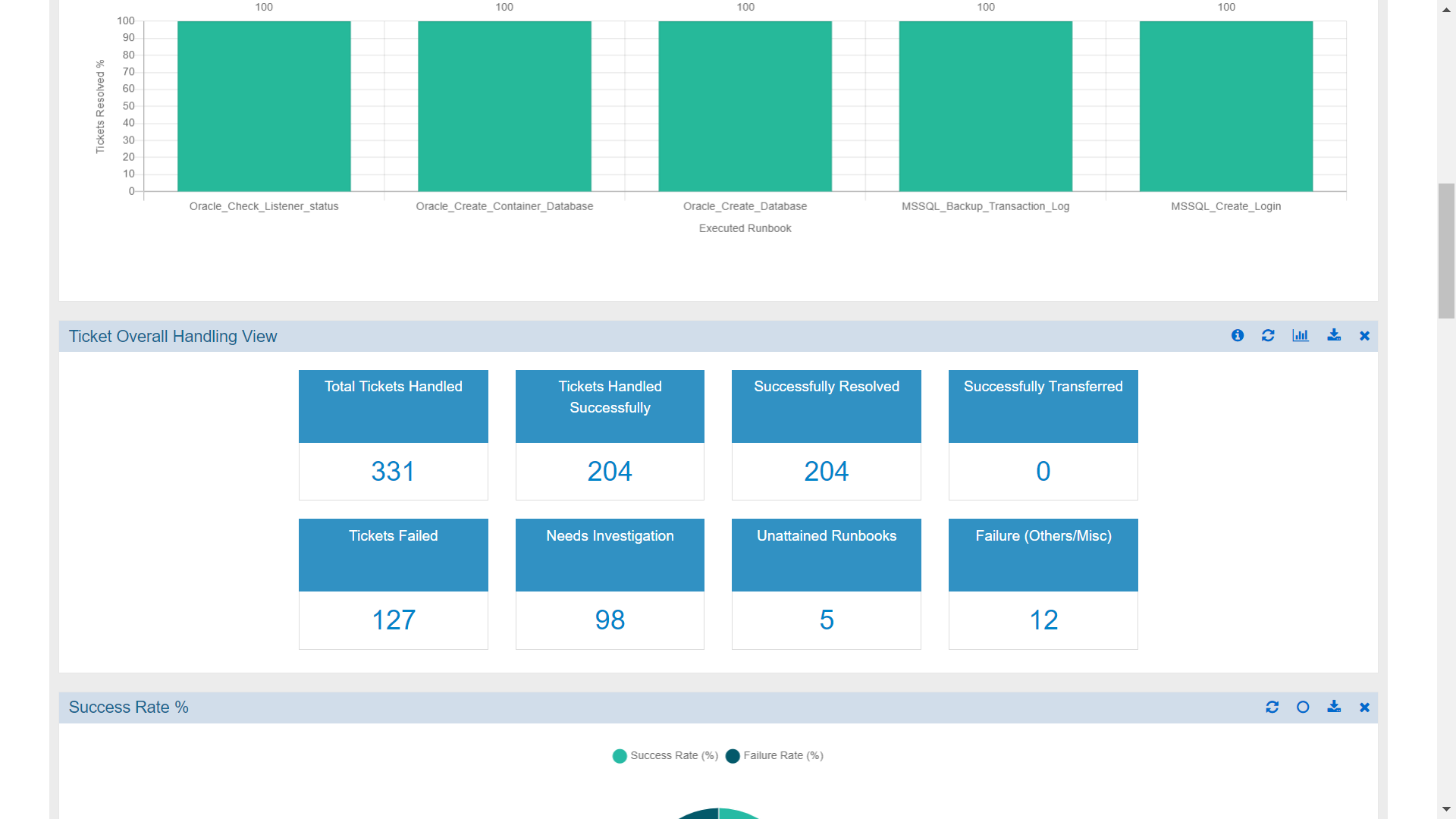 - When hovered on Successful Count graph, it displays the no. of successful tickets for the defined period. When hovered on Failed Count graph, it displays the no. of failed tickets for the defined period and when hovered on the Success %, it shows the percentage of successful tickets for the mentioned period.