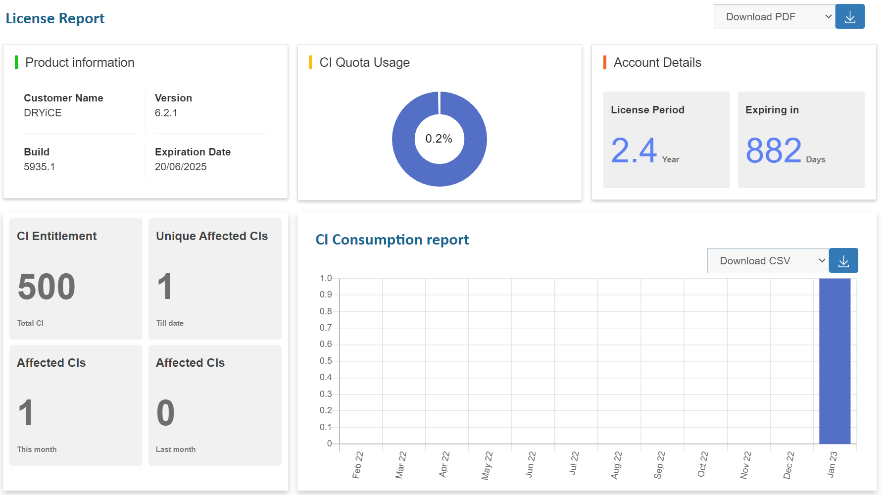 - CI Consumption Report: It displays the graphical representation of the CIs consumed over the last one year. User can download the CSV report for this graphical data.