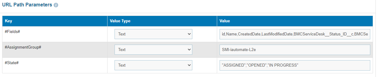 - Sample URL - https://localhost/services/data/v45.0/query?q=SELECT+#Fields#+from+BMCServiceDesk__Incident__c+WHERE+BMCServiceDesk__queueName__c+=+'#AssignmentGroup#'+AND+BMCServiceDesk__Status_ID__c+IN+(#State#)