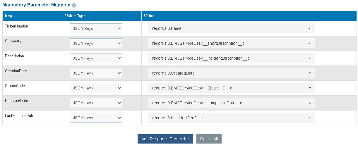 | ResolvedDate | JSON.Keys | records.0.BMCServiceDesk__completedDate__c |