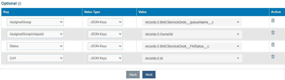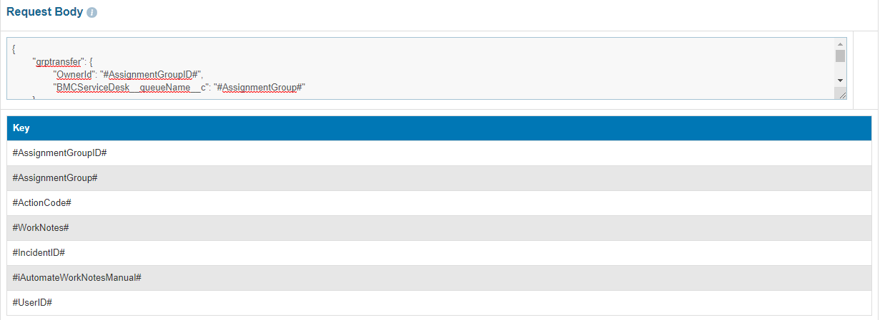 | AssignedGroup | JSON.Keys | records.0.BMCServiceDesk__queueName__c |