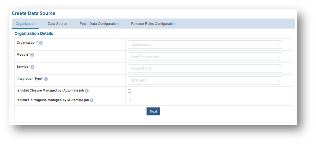 BigFix Runbook AI integrates with Moogsoft for Incident Management (IM) by creating and managing the required IM data sources. Before creating or configuring the data source, ensure that the organization has been set up.