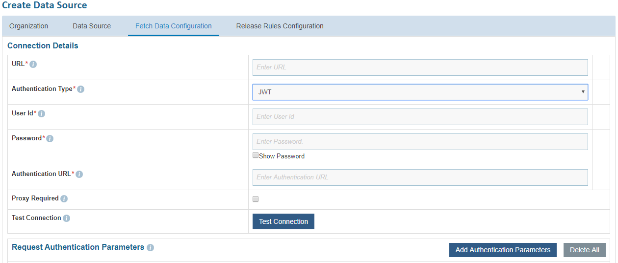- On the Fetch Data Configuration tab, type in the details as per the environment.