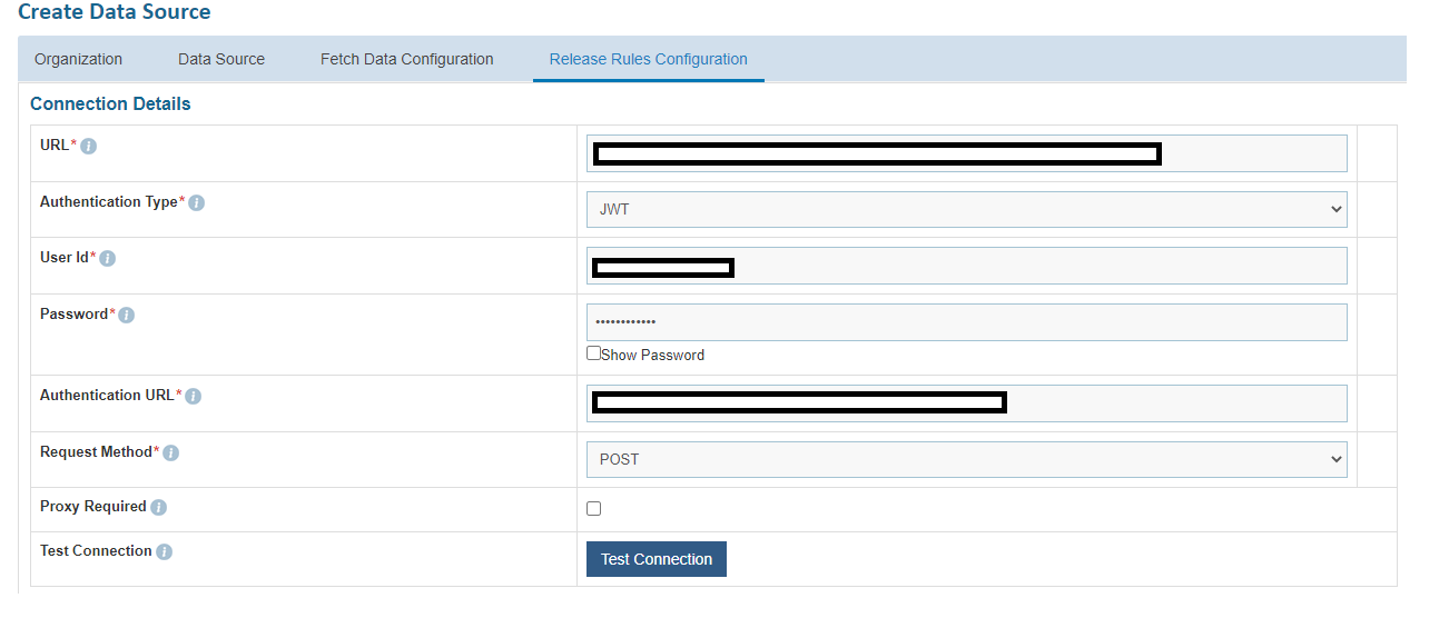 - Click on Test Connection to check accessibility of URL from service. Testing the connection is not mandatory, you can still create Data source.