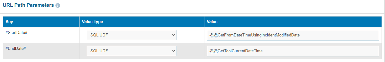 - Sample URL - http://<IP>:<PORT>/iAutomateAPI/Request/GetIncidentTicketData/11?start_date>=#startdate#&end_date<=#enddate#