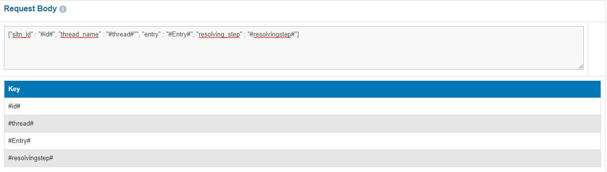 {"sitn_id" : "#id#", "thread_name" : "#thread#"", "entry" : "#Entry#", "resolving_step" : "#resolvingstep#"}