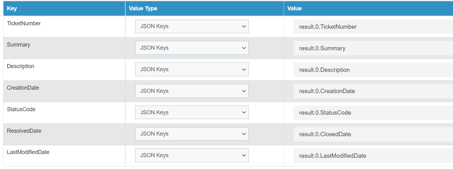 | TicketNumber | JSON.Keys | result.0.TicketNumber |