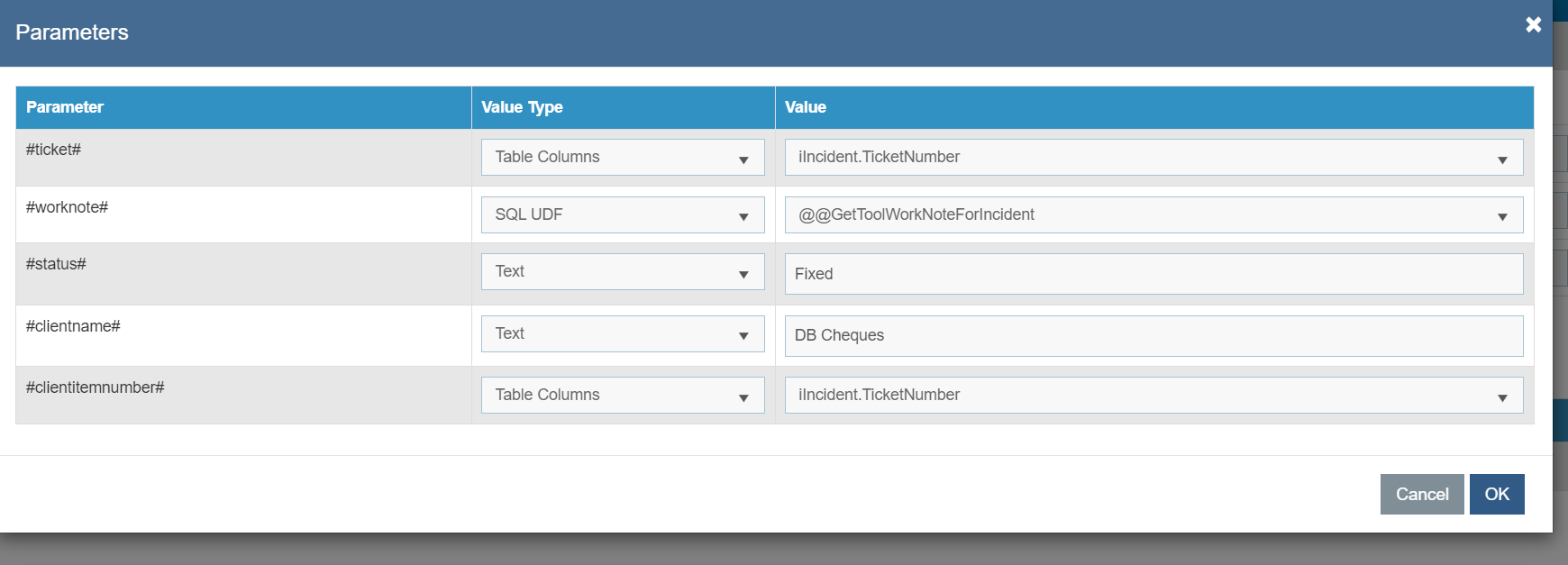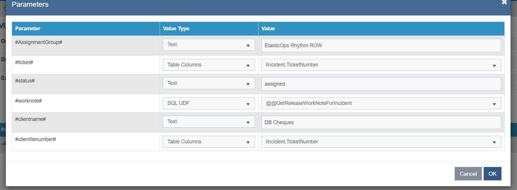 - Map the parameter #worknote# with @@GetReleaseWorkNoteForIncident as Value and SQL UDF as Value Type.