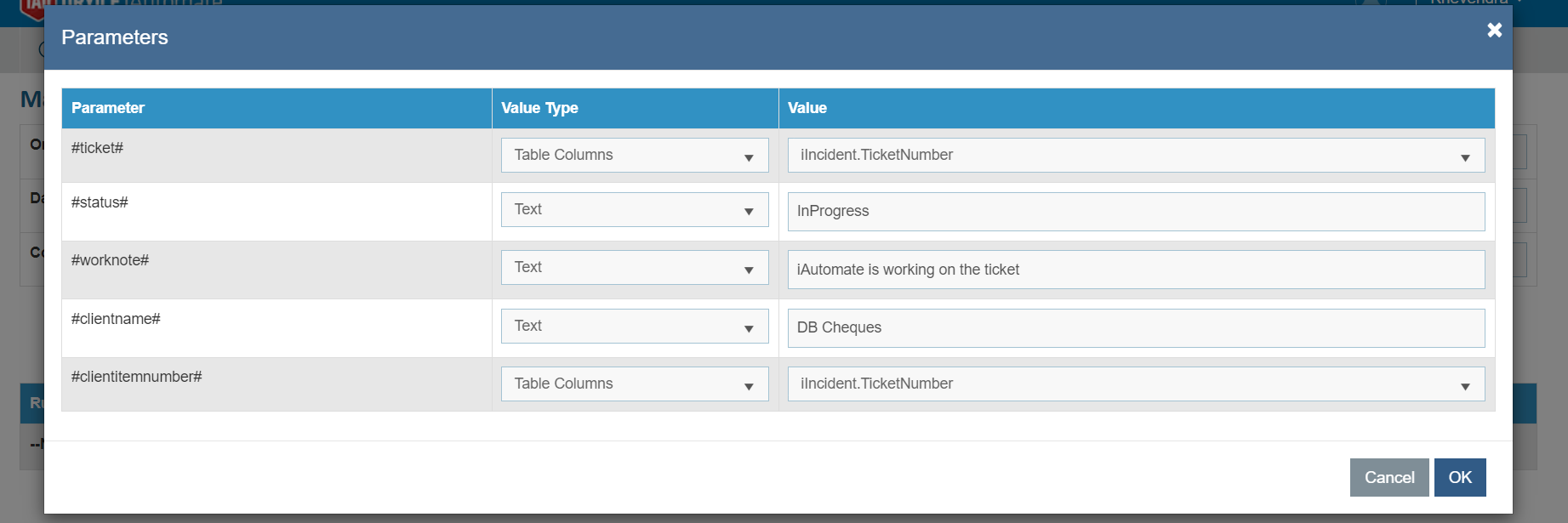 - Map the parameter #ticket# with iIncident.TicketNumber as value and value type is Table Columns.