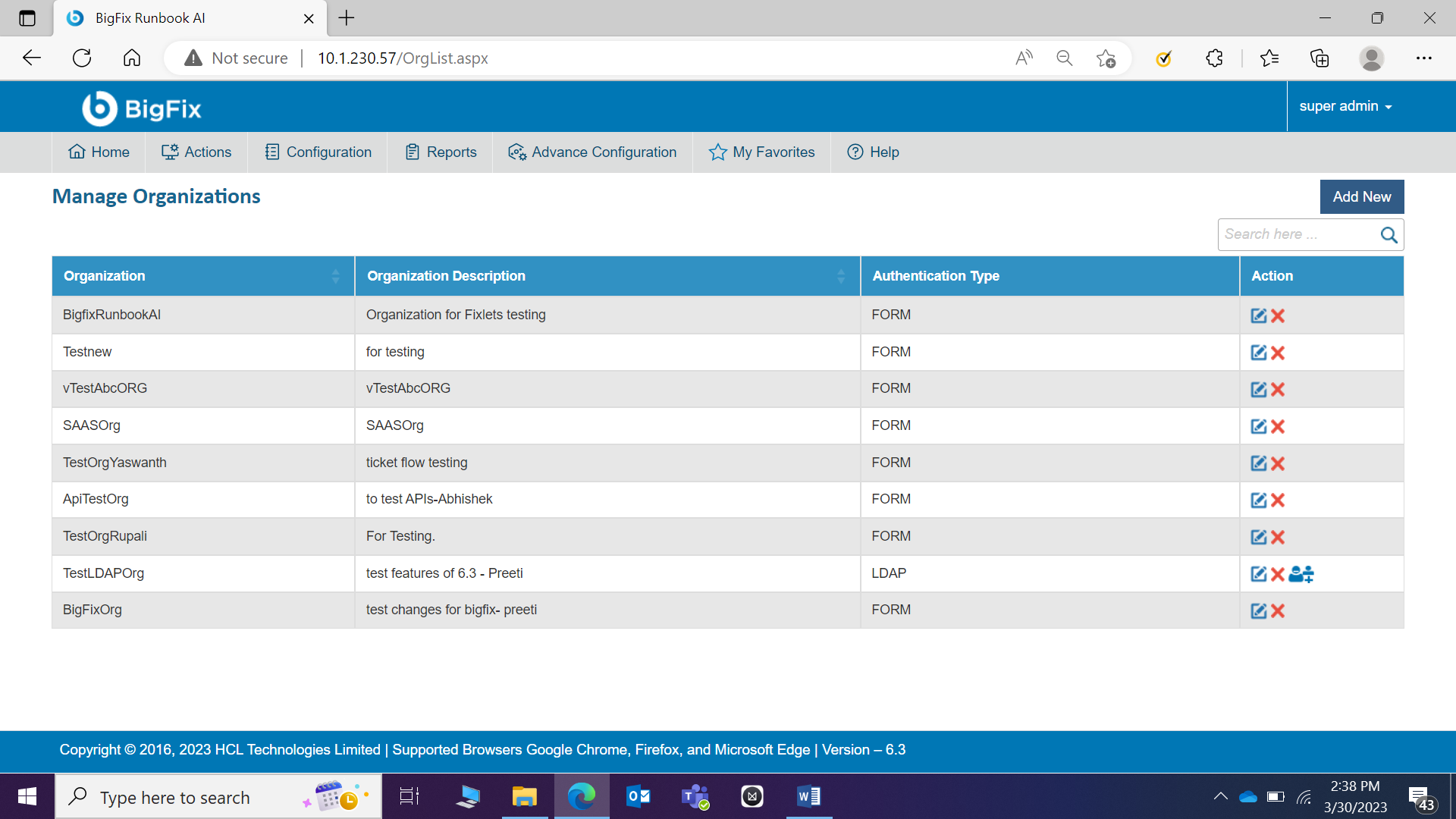 - A list of available organization with the newly created organization will be visible in the list. You can edit the information or delete the organization by clicking on the respective icons under Action section.