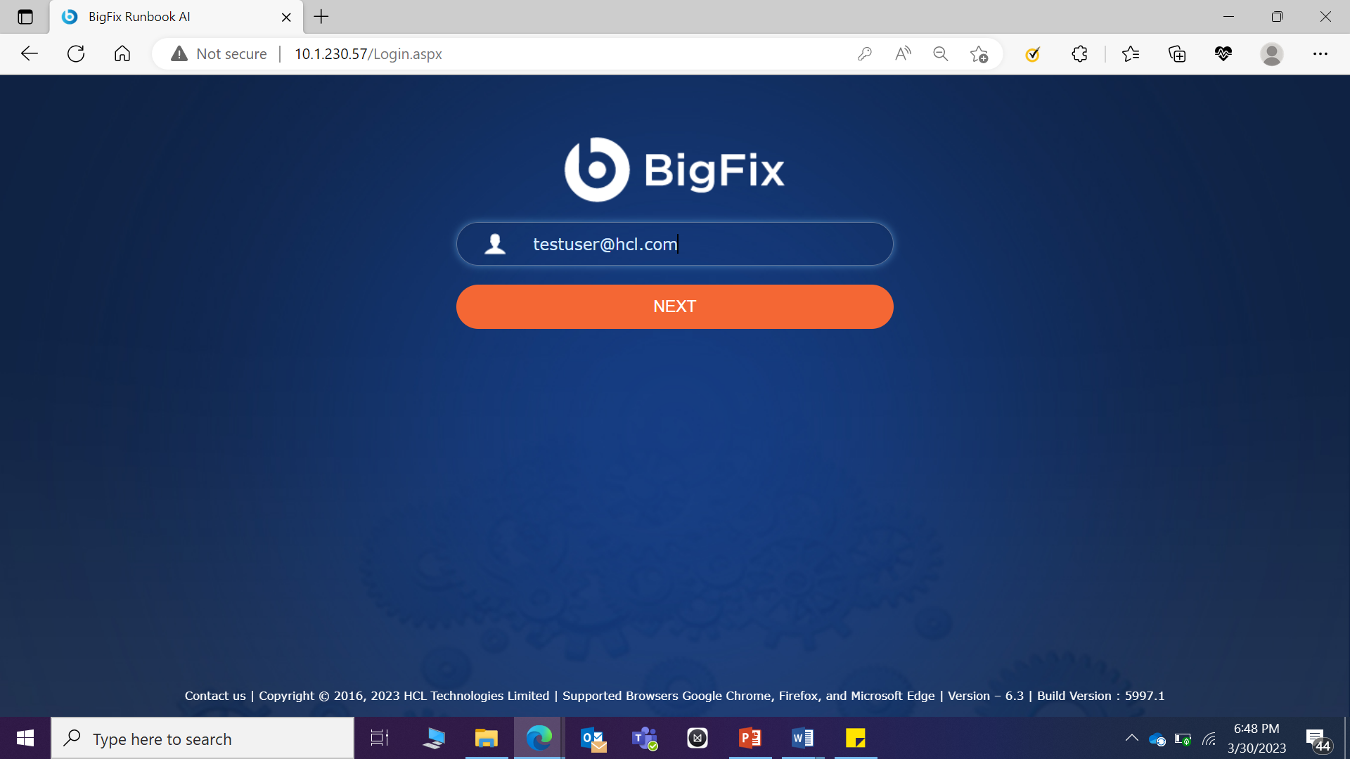 - Open BigFix Runbook AI Web URL and enter testuser@hclcom in Email field.