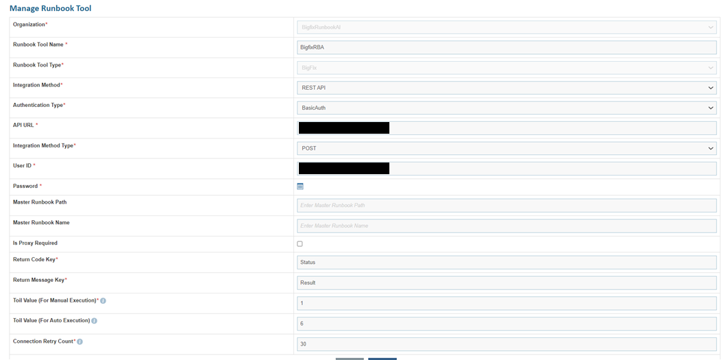 Enter the User ID, Password, Master Runbook Path, Is Proxy Required, Return Code Key, Return Message Key provided by the Runbook Automation Tool team in the respective fields.