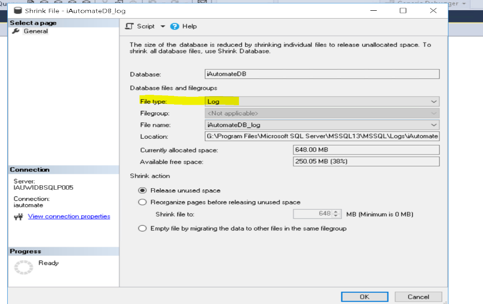 - Check the space in Log drives of database (G:\Program Files\Microsoft SQL Server\MSSQL13\MSSQL\Logs)