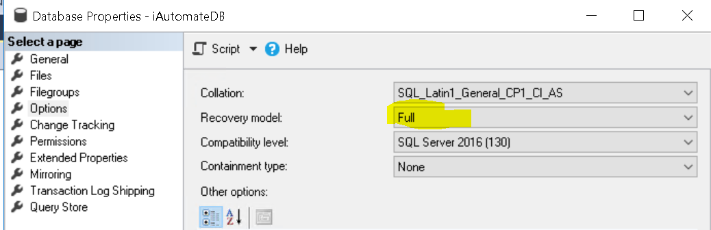 - Now again select database right click and go to the property change the recovery model from Simple to Full.