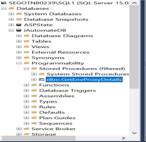 - Now login to SSMS > Expand database > Expand iautomate db > Expand programibility > Expand stored procedures and filter as getenvproxy as shown below.