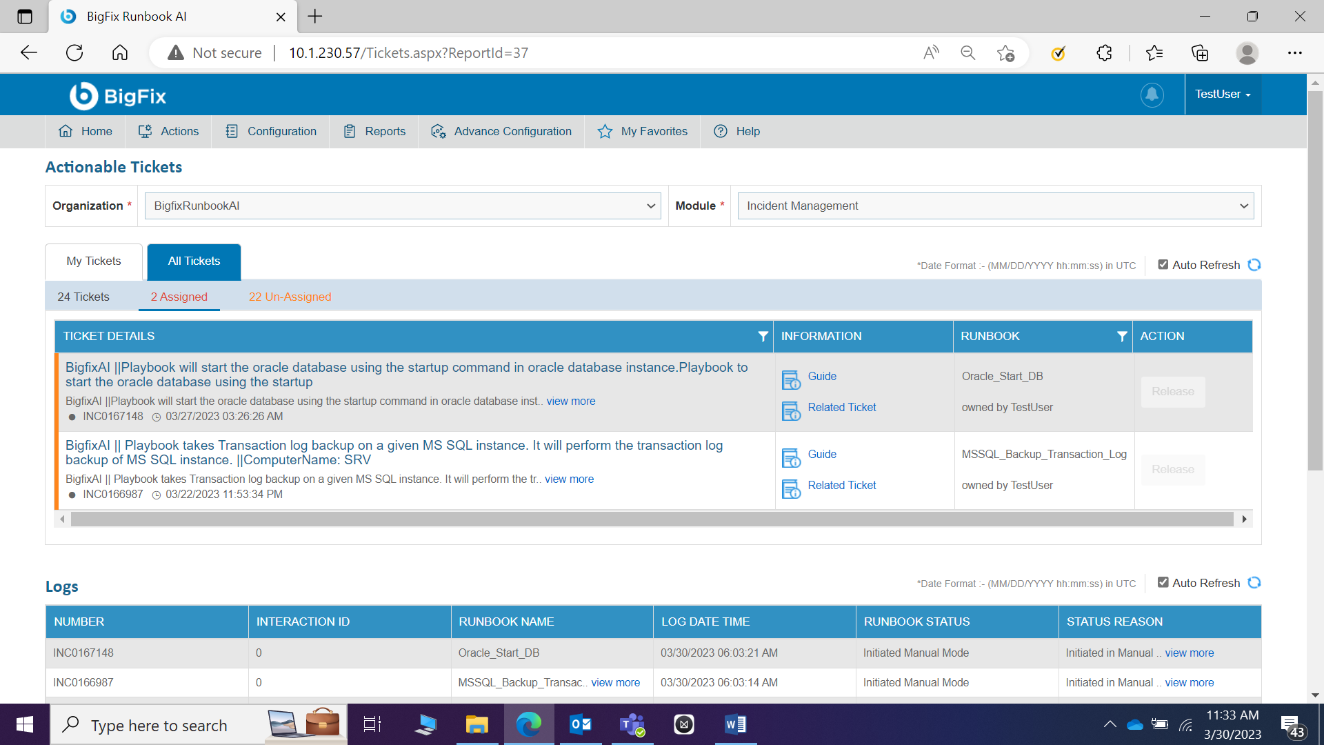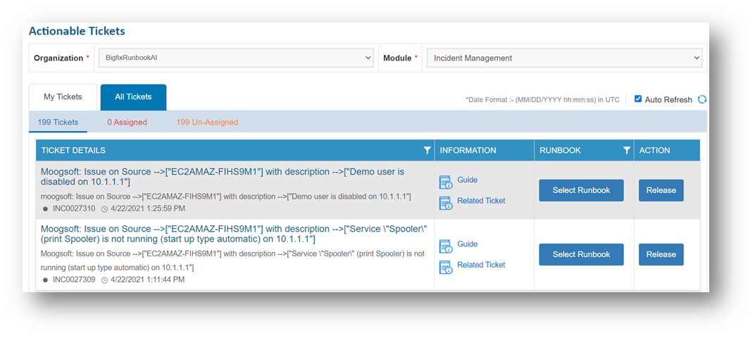 - In case of Assigned Ticket, the user and the runbook operating on the ticket are displayed.