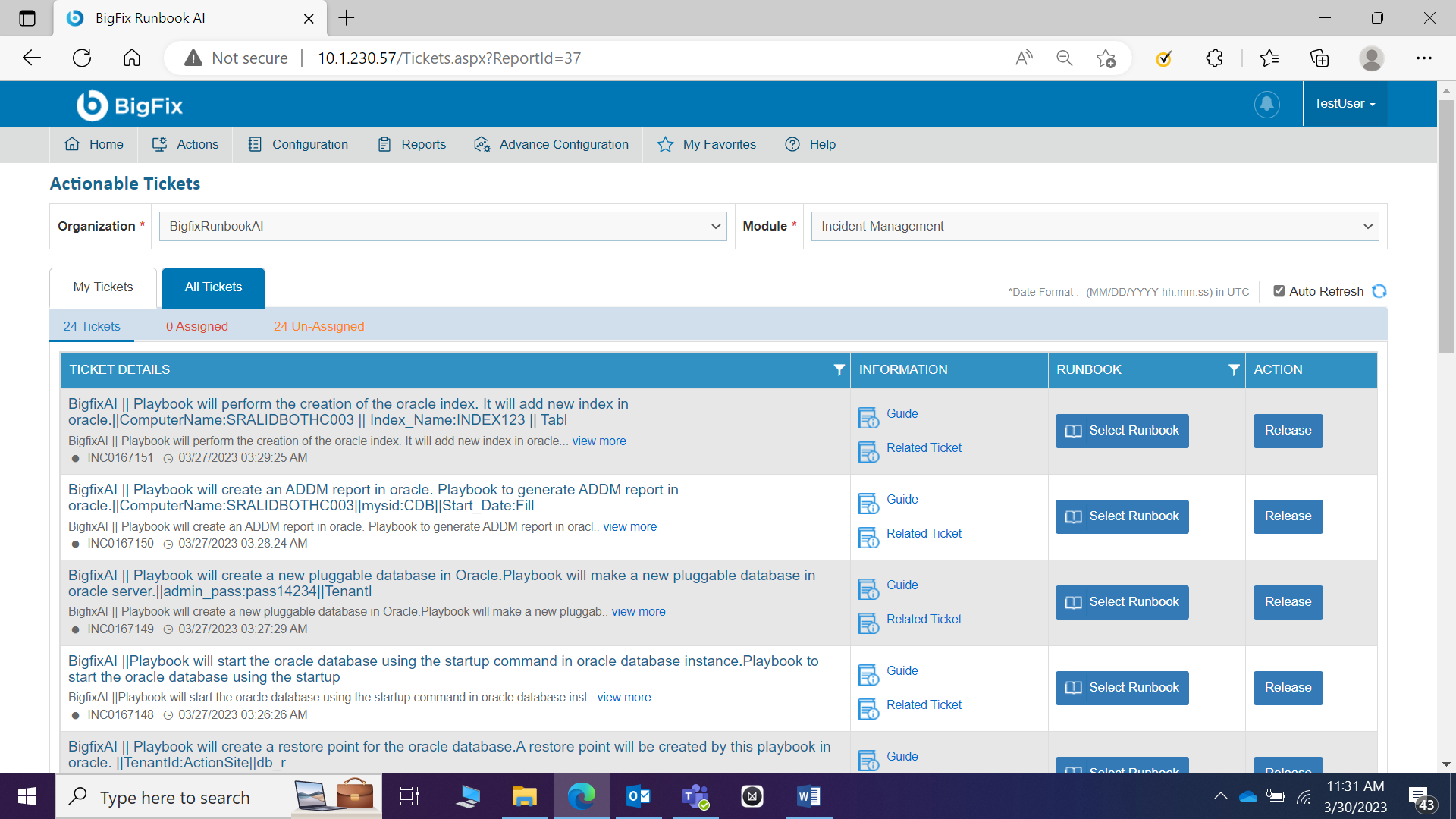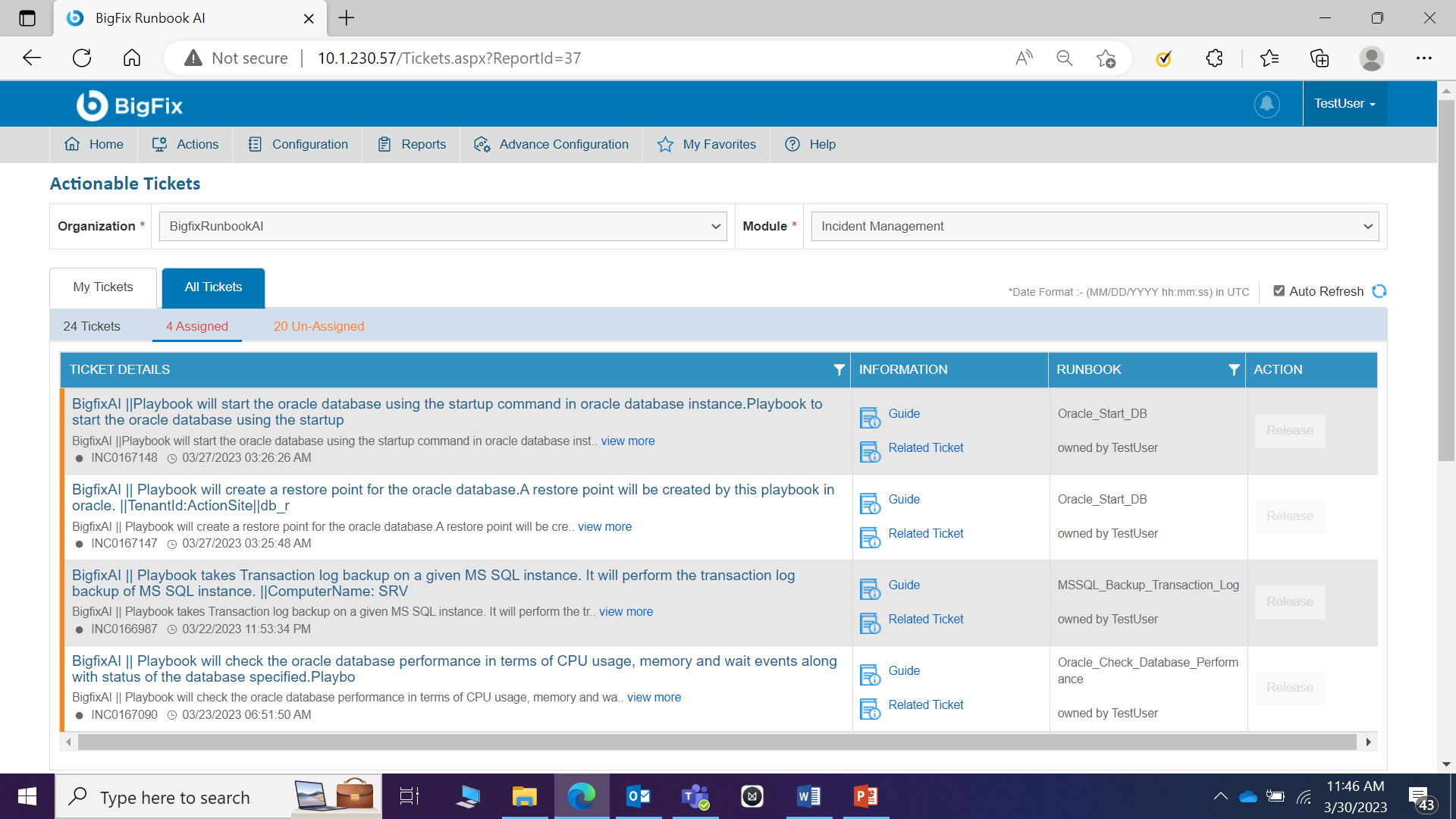 Lists the tickets that are a part of the BigFix Runbook AI queue and must be executed by BigFix Runbook AI Lists the consolidated tickets from the Assigned and Unassigned tabs |
