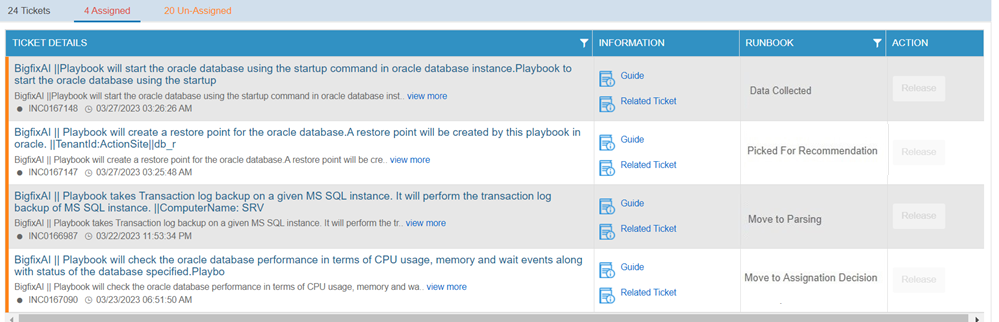 A subset of the Tickets tab; lists the tickets allotted for either automated or manual execution Shows the allocation status of a ticket and the runbook initiated for it |