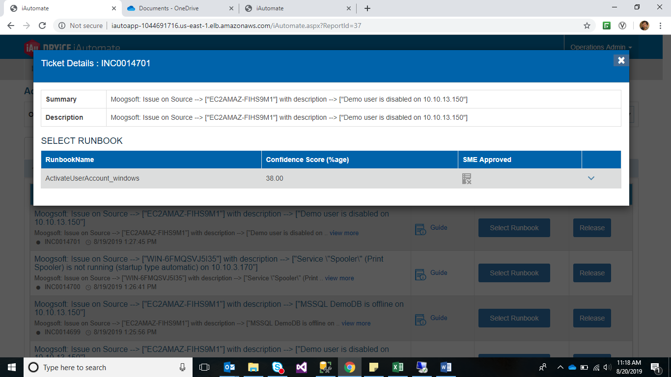 - A pop-up window displays the summary and description of the tickets and the list of runbooks in descending order of confidence score.