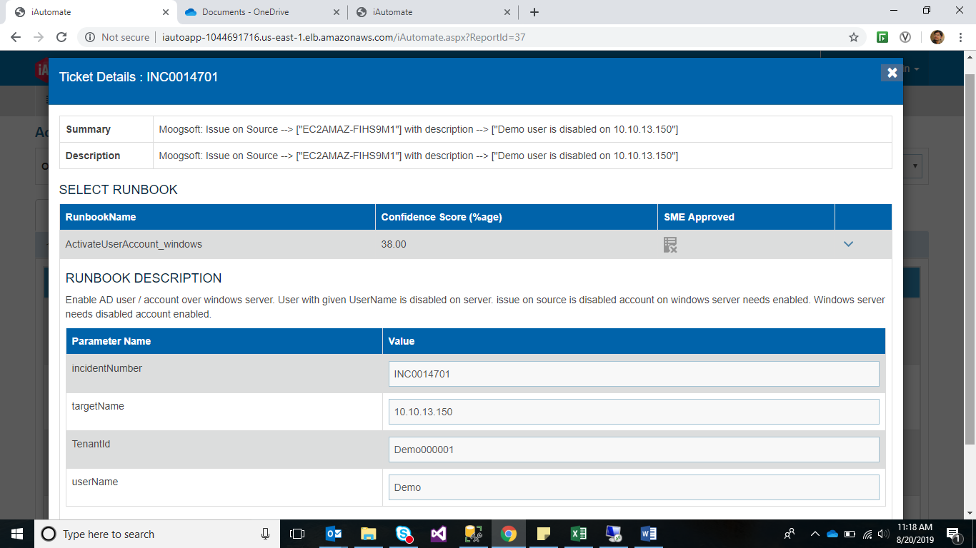 - This displays the runbook description and parameters for the selected runbook. These parameter values are retrieved from the ticket. The user may select the runbook with the highest confidence score or the one recommended by the SME.