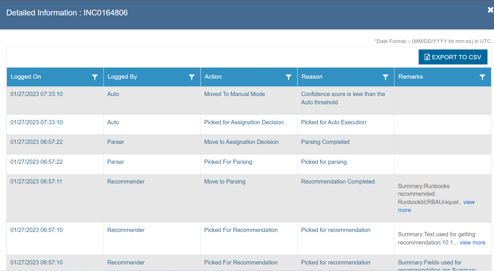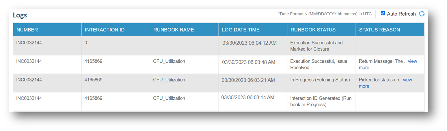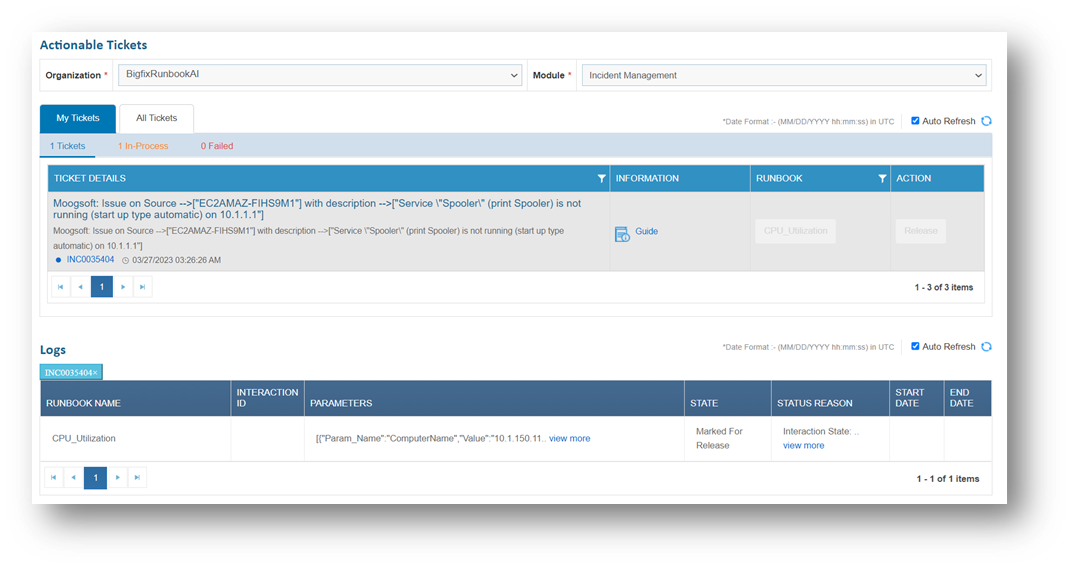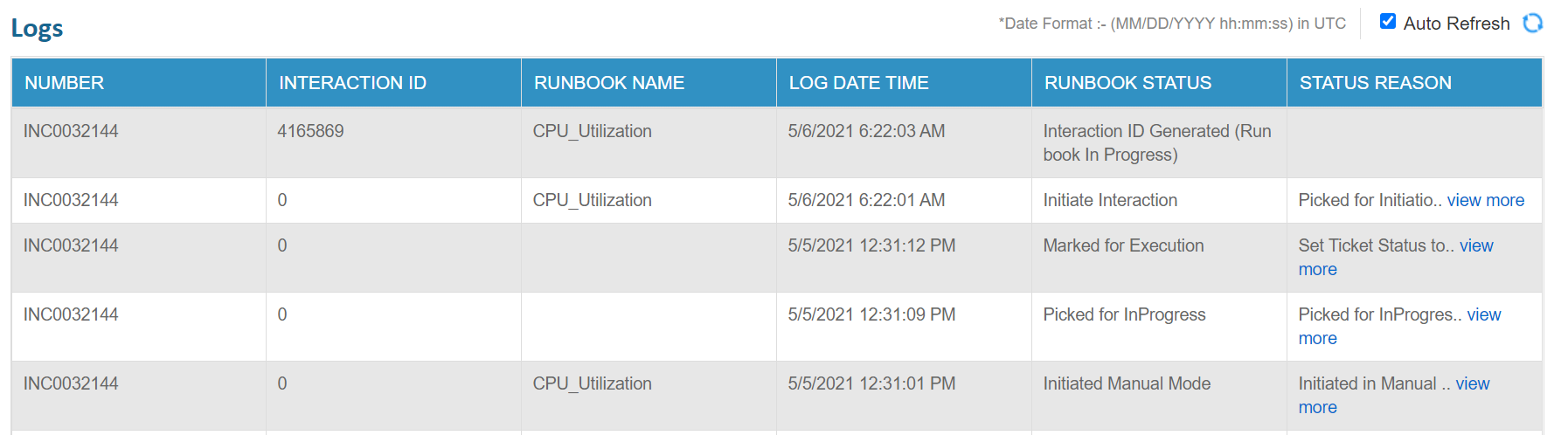 - In the Ticket or In-Process tabs, clicking an incident number displays the ticket-specific log in the Logs tab, which provides a runtime update for the selected ticket with the following details: