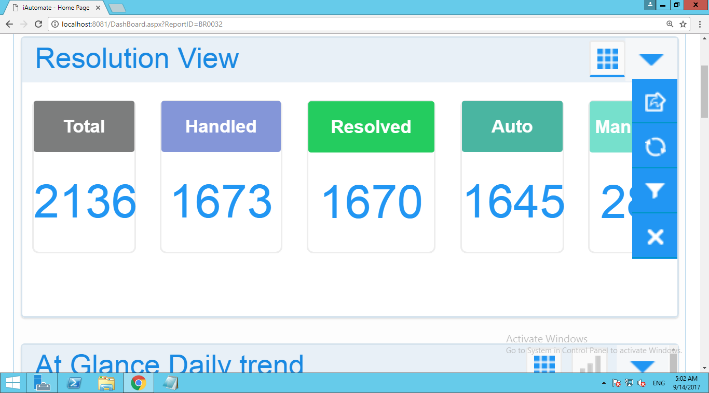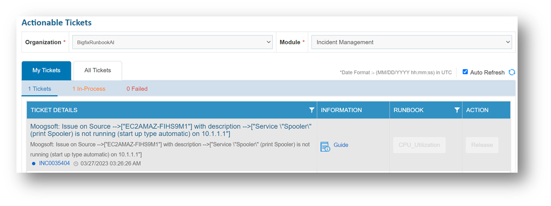 - The Actionable Tickets screen appears, displaying the summary and status of all tickets. It also lists the in-progress or failed tickets, either auto-executed or manually executed, in the following tabs: