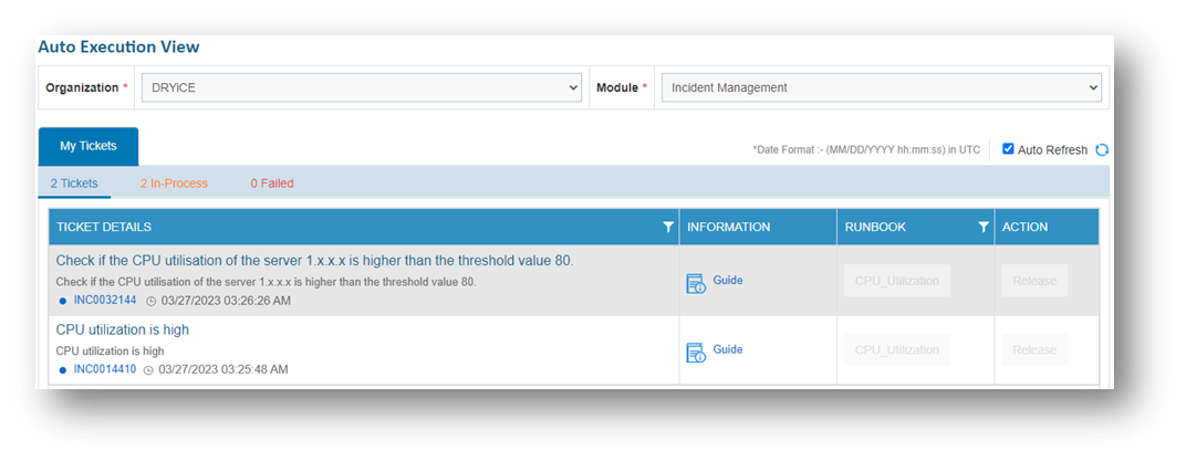 - The Auto Execution View screen is displayed listing the selected organization and module-specific tickets under the My Tickets tab.