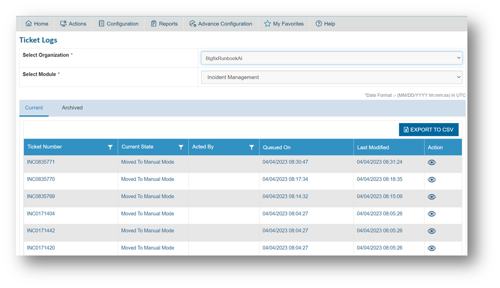- Current: Lists the log details of the tickets available for execution in the selected organization, including the ticket number, current state, acted by, queued on, and last modified information.