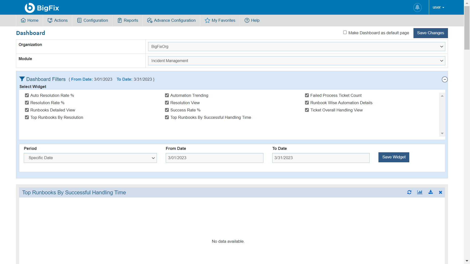 BigFix Runbook AI allows users to respond to unresolved open tickets, keep a log of the archived tickets closed by BigFix Runbook AI, and automatically update the dashboard to let users view key performance indicators and metrics at a glance.