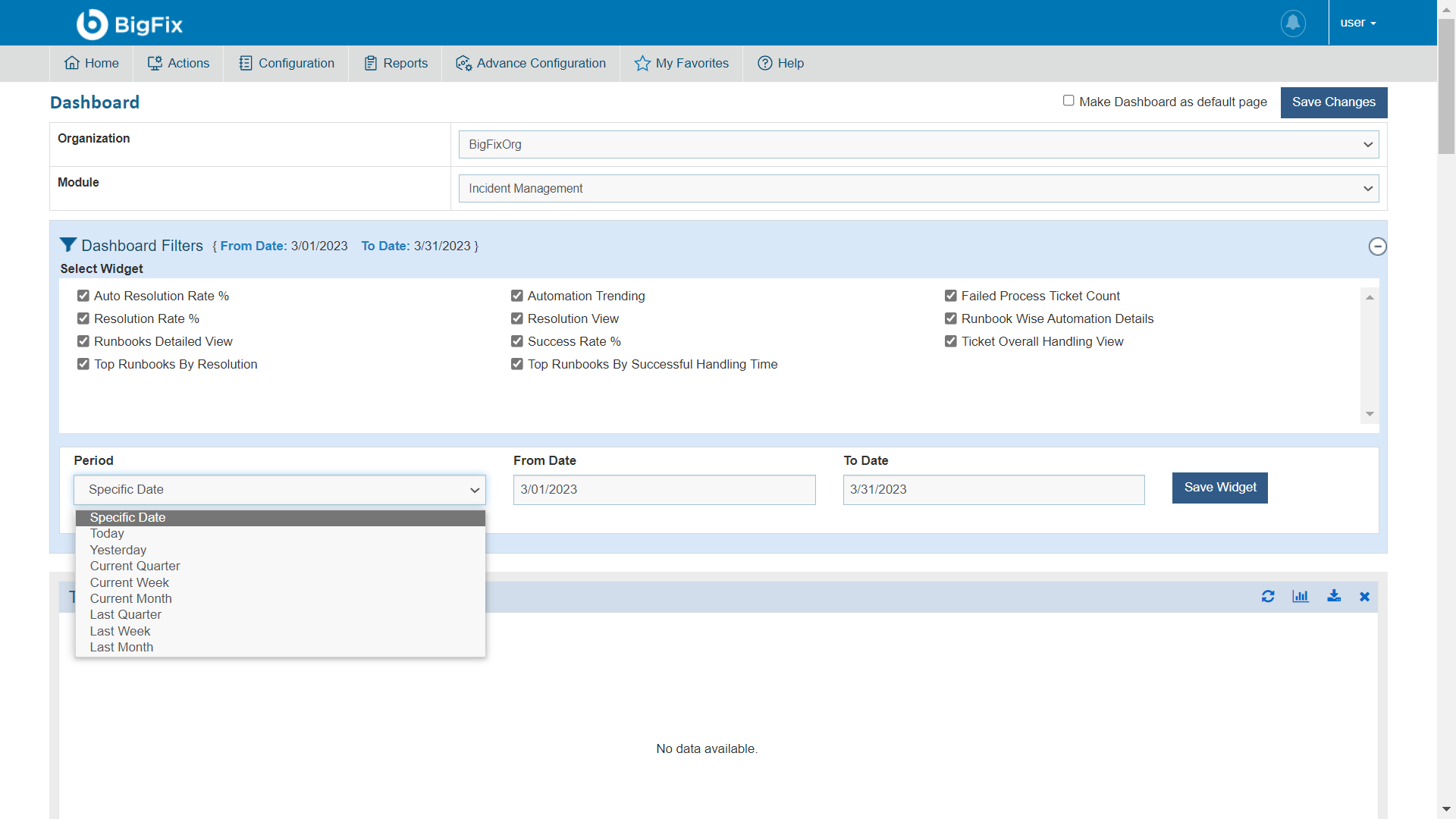 - Select the checkboxes next to the widgets you want to include, then select the time frame from the drop-down list of the Period, and then select the date range in the From Date and To Date fields and then click Save Widget.