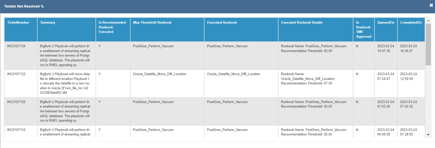 - In addition to the confidence score, the SME Approved column displays the result of SME validation against the runbooks. Both parameters help the user to identify the runbook for execution.