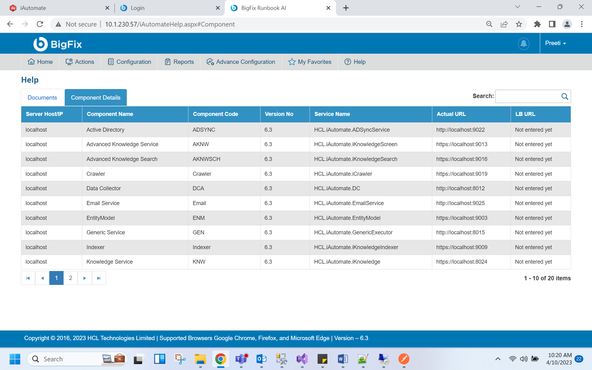 - This tab displays all the components running on BigFix Runbook AI along with the server Host/IP on which component is running, the name of the component, component code, the version of BigFix Runbook AI currently running, the service name with which component is installed, the actual URL along with port on which component is running and the LB URL, if exists, for the component.