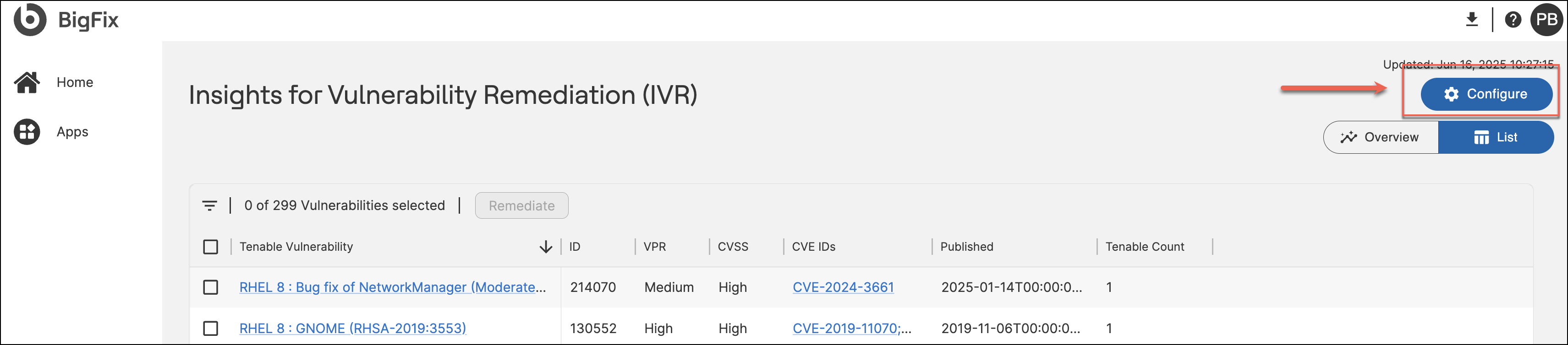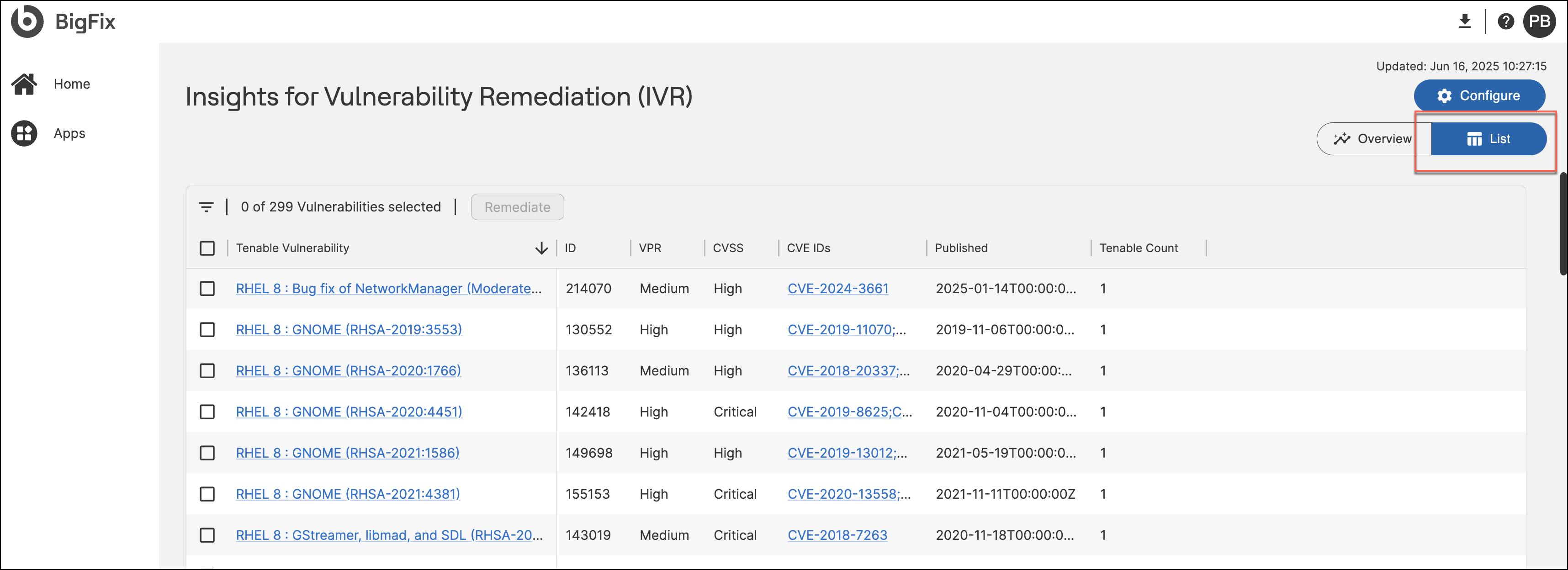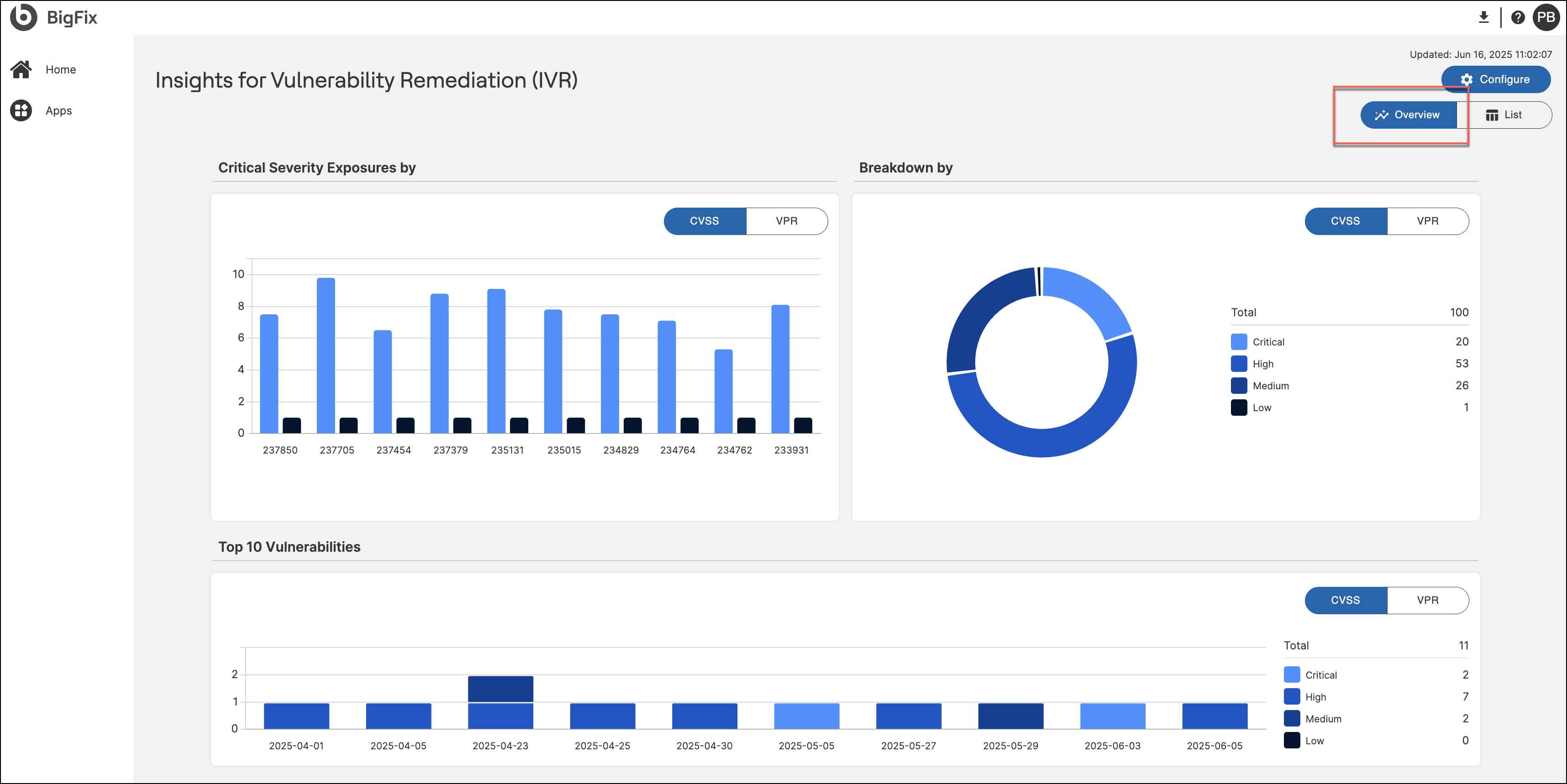 Users can switch between Overview, List, and Configure modes using the buttons in the upper-right corner. Each chart includes a scoring filter toggle to switch between CVSS and VPR views, offering flexibility in how vulnerability data is analyzed.