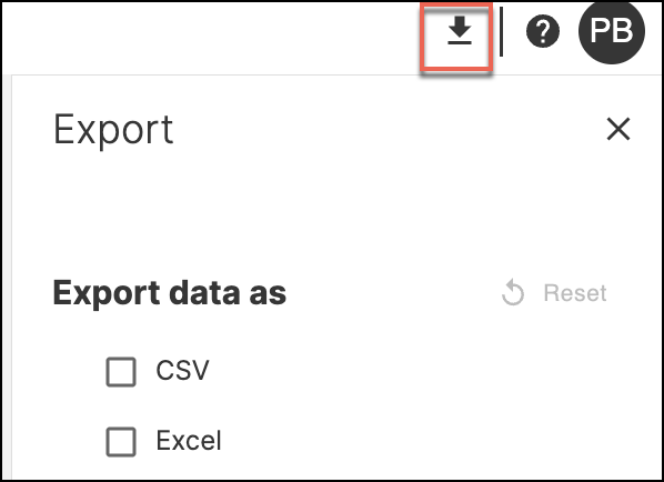 To export the table click download icon in the upper right corner and choose preferred format: CSV or Excel.