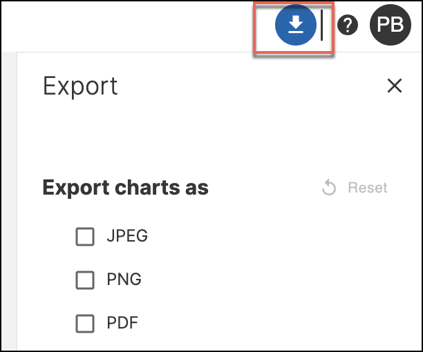To export charts click download icon in the upper right corner and choose preferred format: JPEG, PNG or PDF.