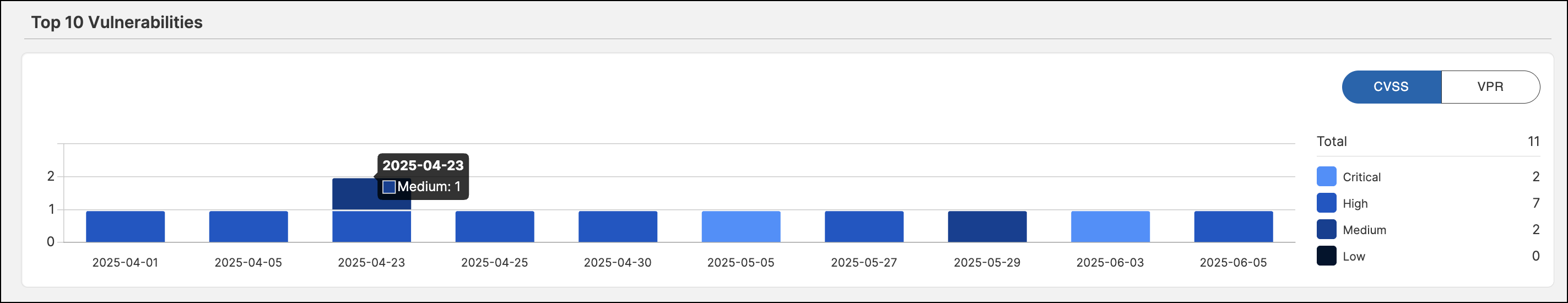 The Top 10 Vulnerabilities chart provides a time-based visual representation of the most significant vulnerabilities tracked within a specified period, helping you identify trends and emerging threats.
