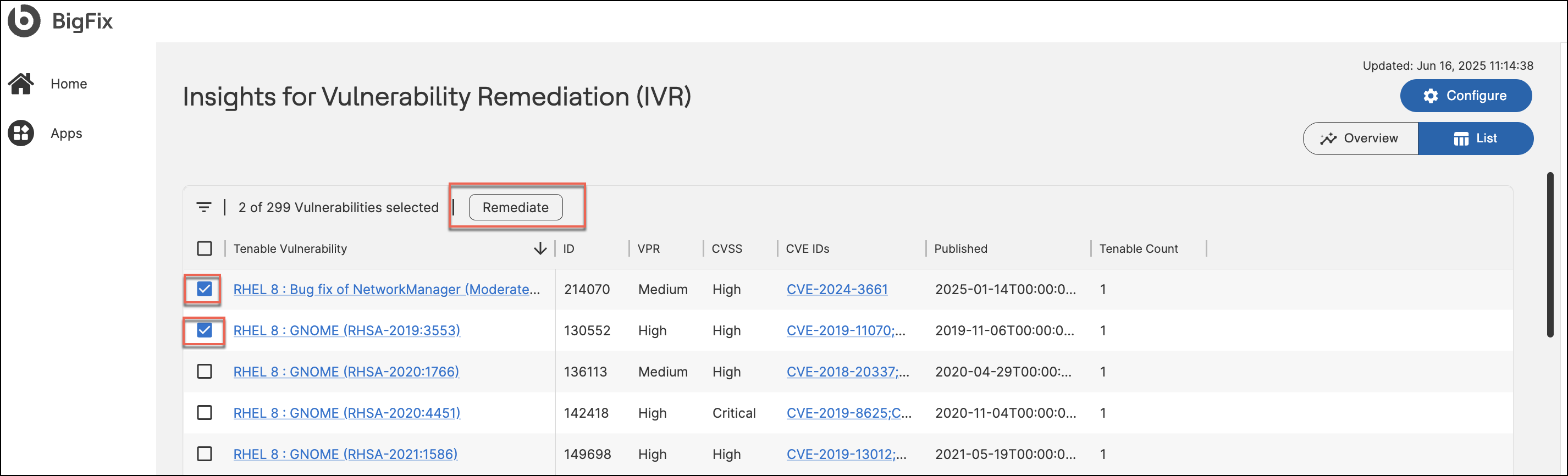 - From the IVR table that lists the Tenable Vulnerabilities, select one or more Vulnerabilities. The Remediate button becomes active.