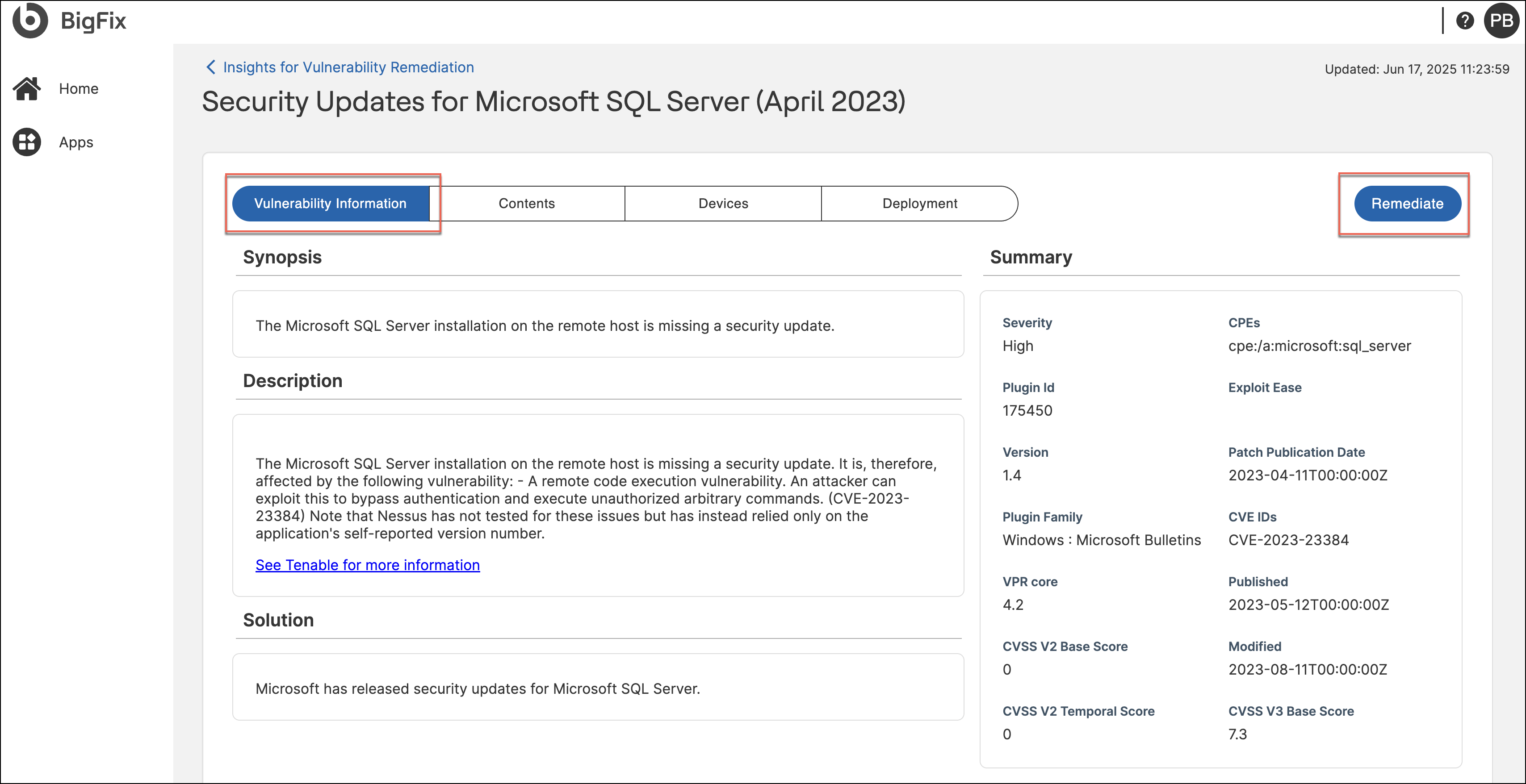 Accessing the Remediate widget from Vulnerability Information tab