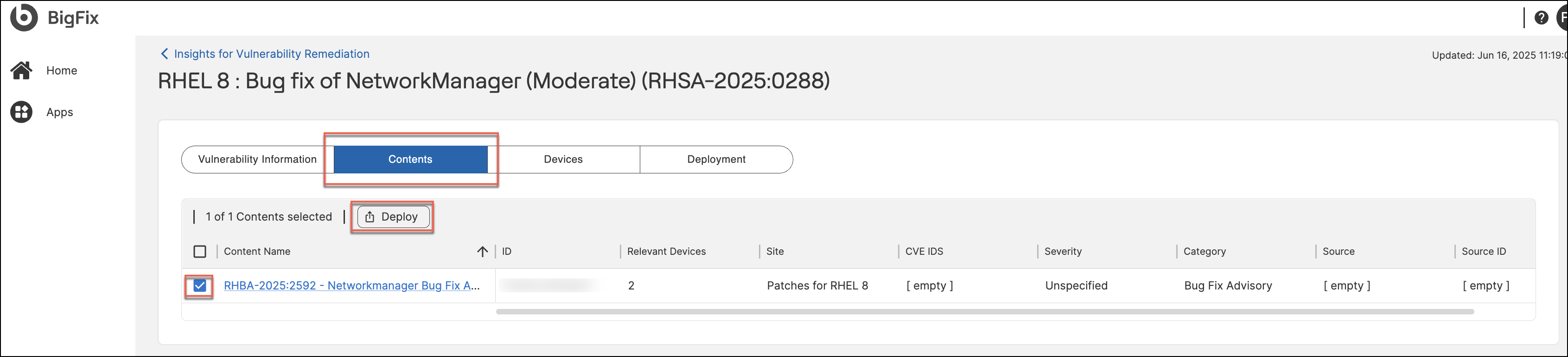 - Go to Contents tab, select conten and click Deploy button to open the Remediate widget.