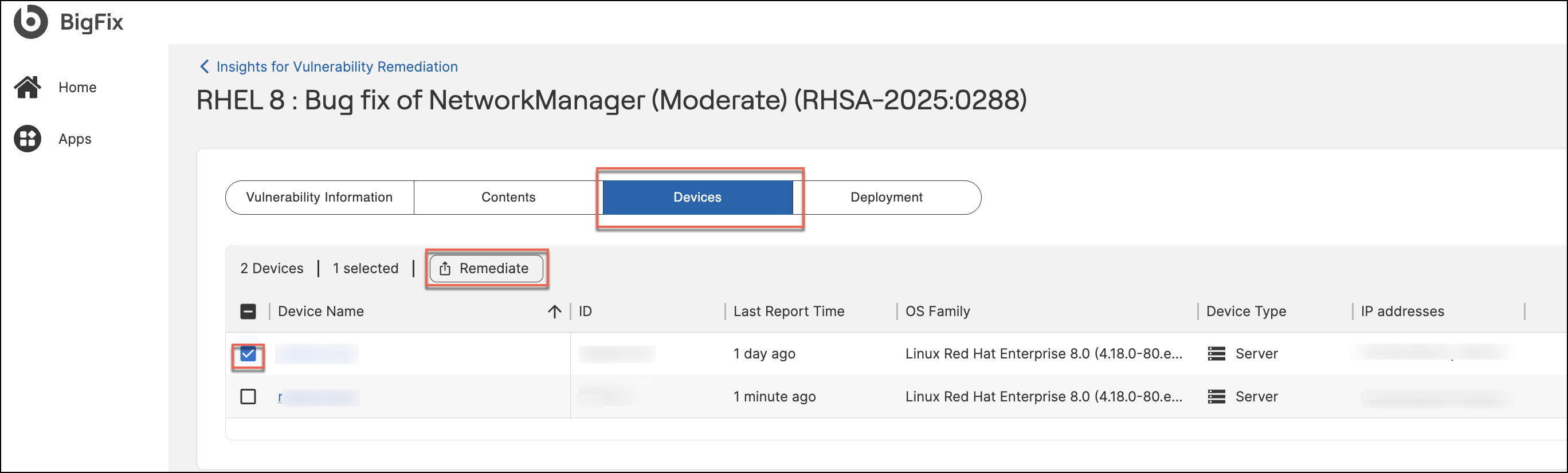 Accessing the Remediate widget from Devices tab