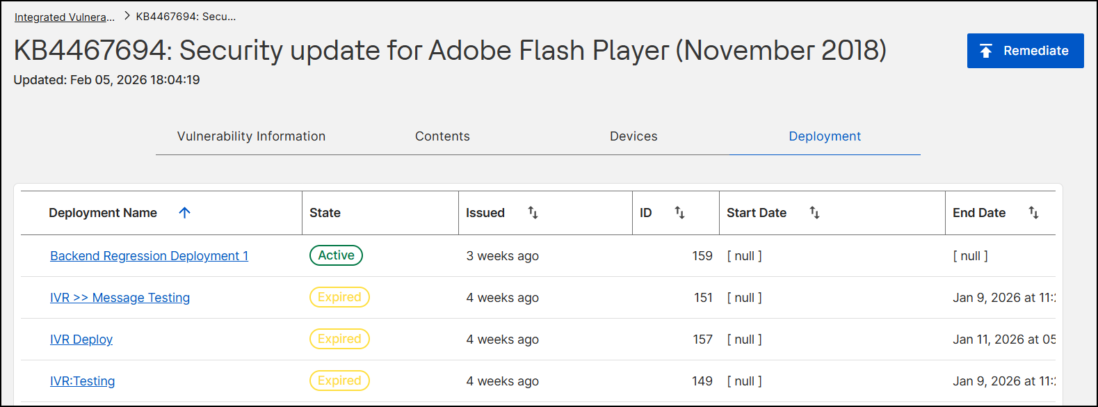 Deployment: Displays the history of all remediation actions previously taken for this specific vulnerability. It lists the Deployment Name, Status (e.g., Active, Completed, Expired), Start Time, and User who initiated the action.