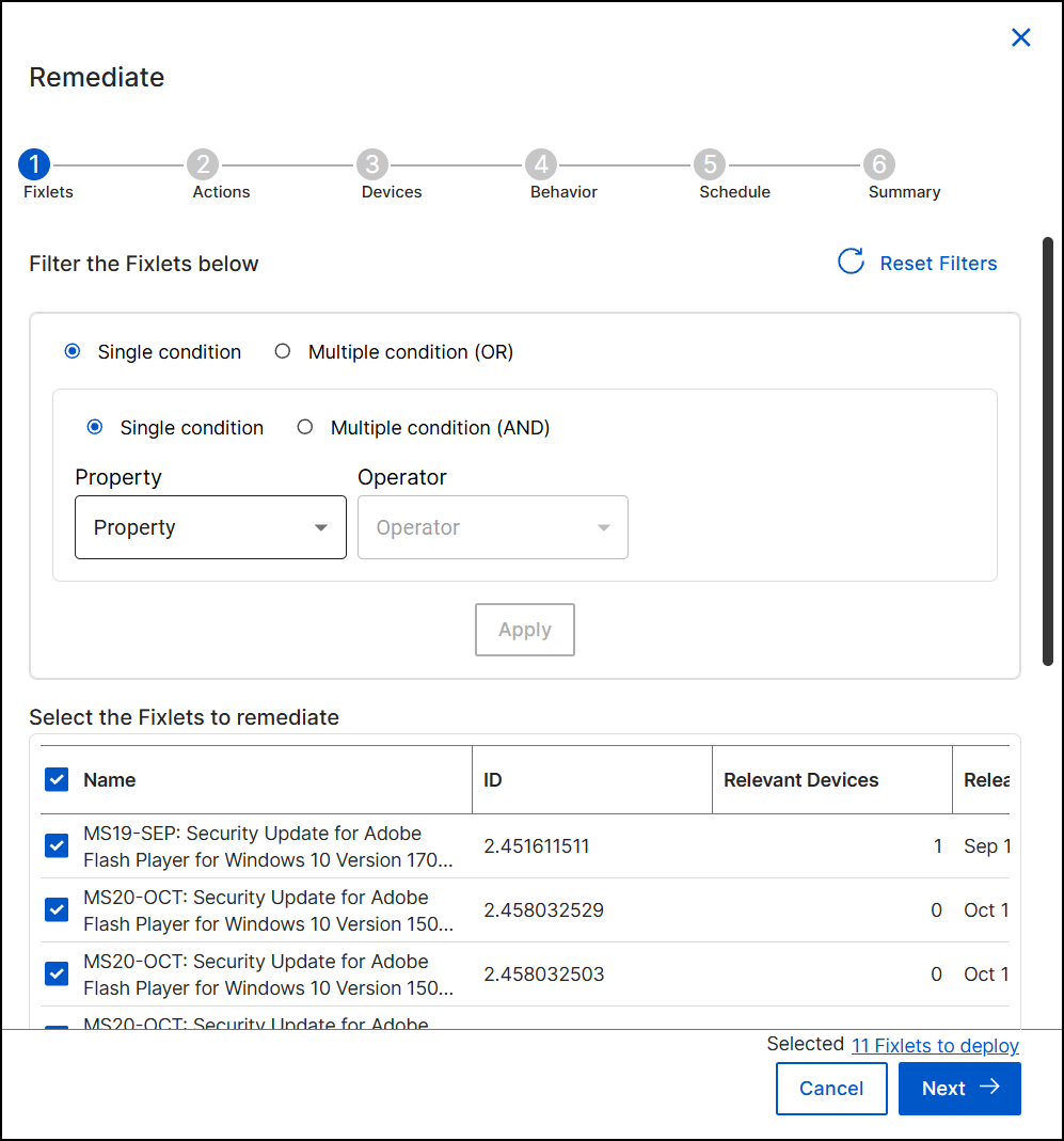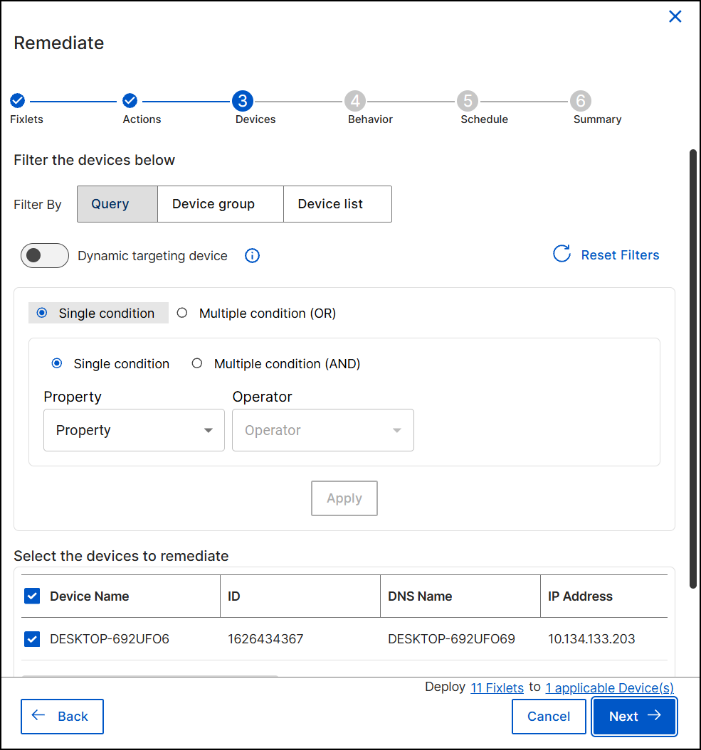 Define which endpoints will receive the remediation. The wizard automatically filters for devices relevant to the selected vulnerability and fixlet(s).