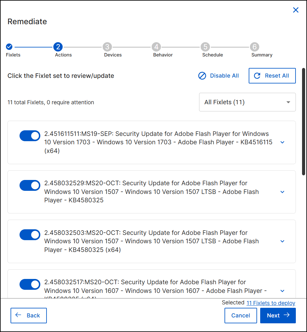 - View the list of Fixlets. Use the toggle switch next to each Fixlet to include or exclude it from this specific deployment.