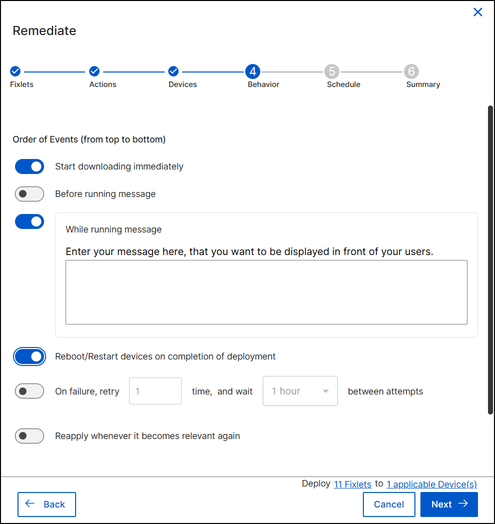 - While running message: Select this option to set a message to display on targeted devices while the deployment is running.