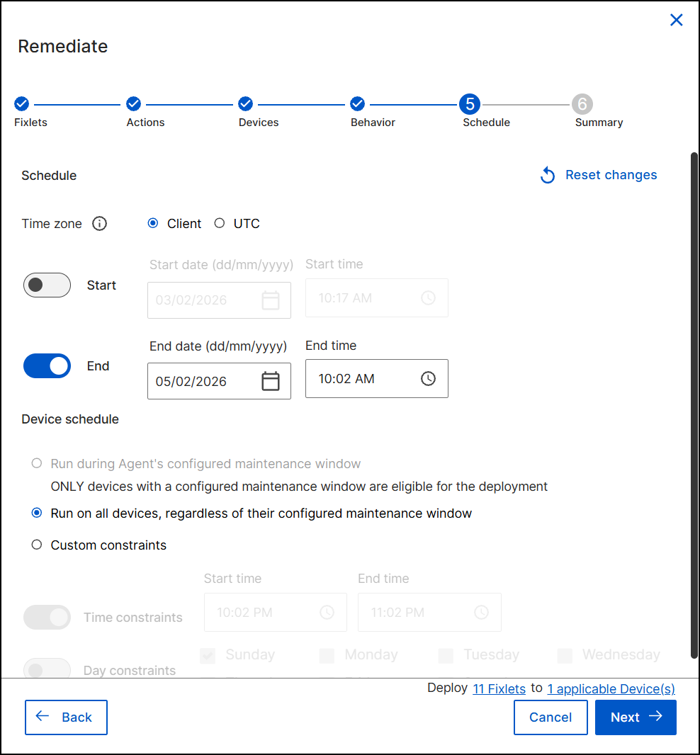 - Run on all devices, regardless of their configured maintenance window: Overrides local maintenance windows to ensure immediate remediation.