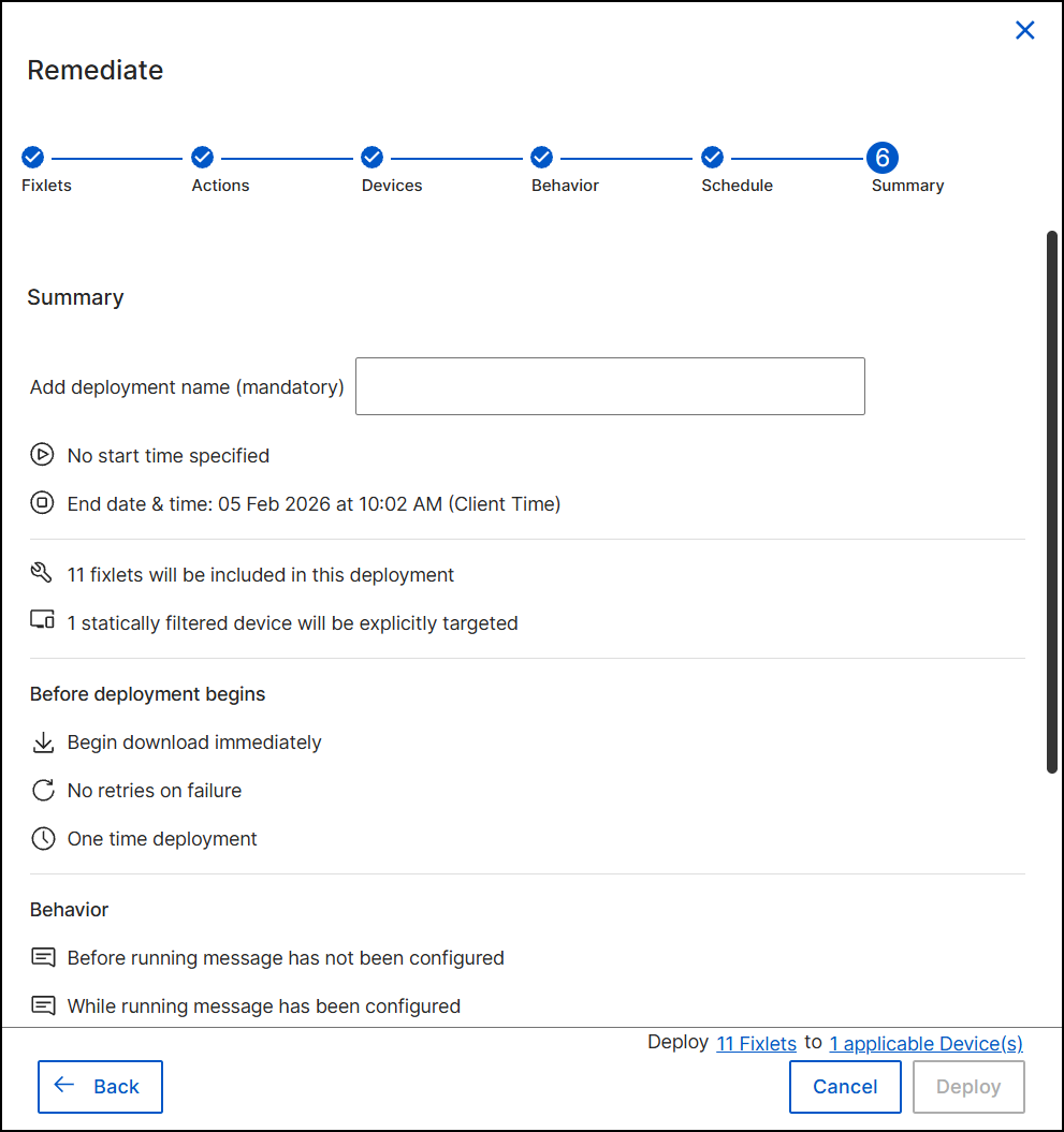 - Review the summary sections (Fixlets, Devices, Behavior) to ensure all settings are correct.