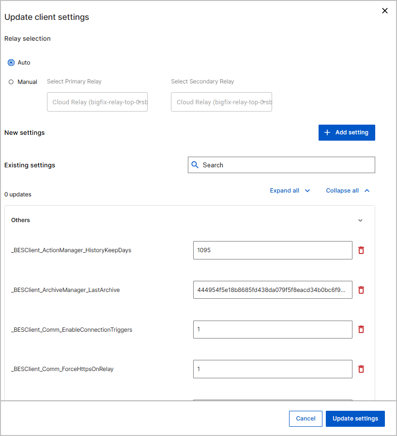 - All existing BigFix Platform client settings of the selected device are listed in collapsible categories (For example, Action execution, Action management, Archiving client files and so on).