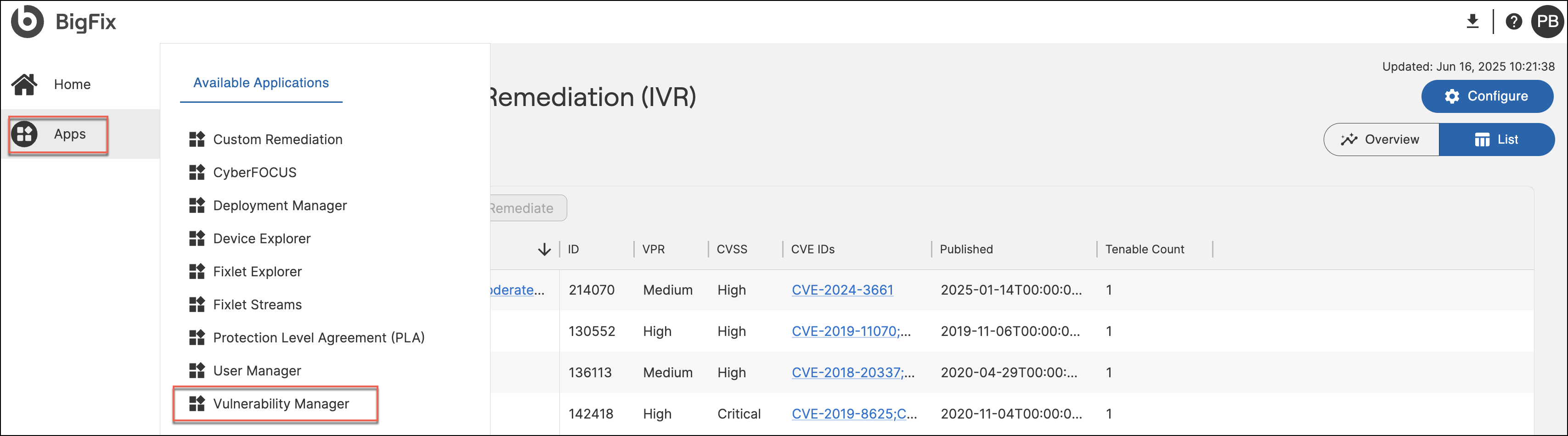To access the Vulnerability Manager, from BigFix SaaS Remediate, click .